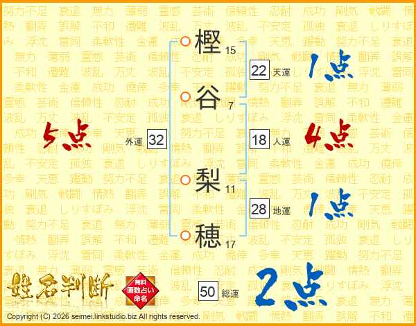 樫(15画)谷(7画) 梨(11画)穂(17画)