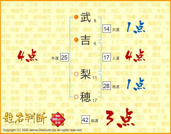 武(8画)吉(6画) 梨(11画)穂(17画)