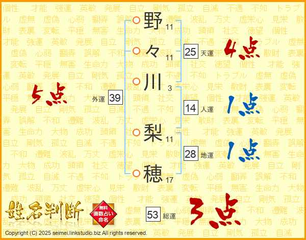 野(11画)々(11画)川(3画) 梨(11画)穂(17画)
