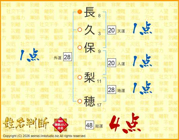 長(8画)久(3画)保(9画) 梨(11画)穂(17画)