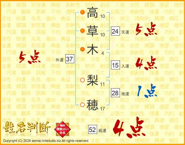 高草木梨穂さんの総運は52画の4点!