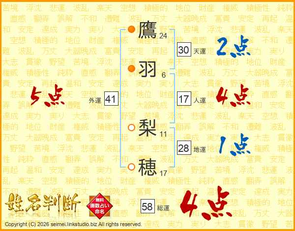 鷹(24画)羽(6画) 梨(11画)穂(17画)