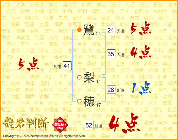 生活面を象徴する運勢です。外部から受ける影響力を表し、結婚運、家庭運や職場、環境への順応性を表します。総運から人運を引いた画数。姓や名が1文字の場合を除く。