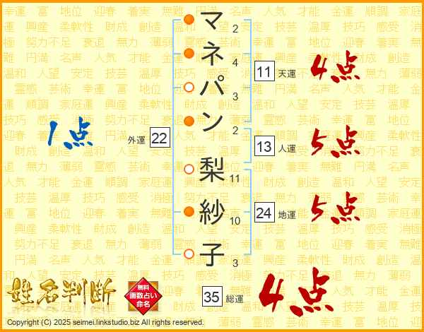 マ(2画)ネ(4画)パ(3画)ン(2画) 梨(11画)紗(10画)子(3画)