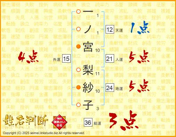 一(1画)ノ(1画)宮(10画) 梨(11画)紗(10画)子(3画)