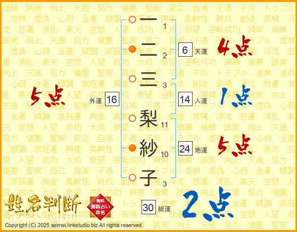 一(1画)二(2画)三(3画) 梨(11画)紗(10画)子(3画)
