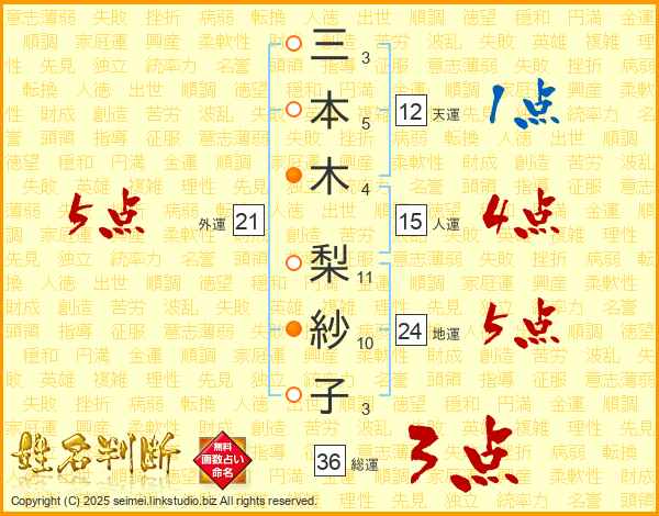 三(3画)本(5画)木(4画) 梨(11画)紗(10画)子(3画)