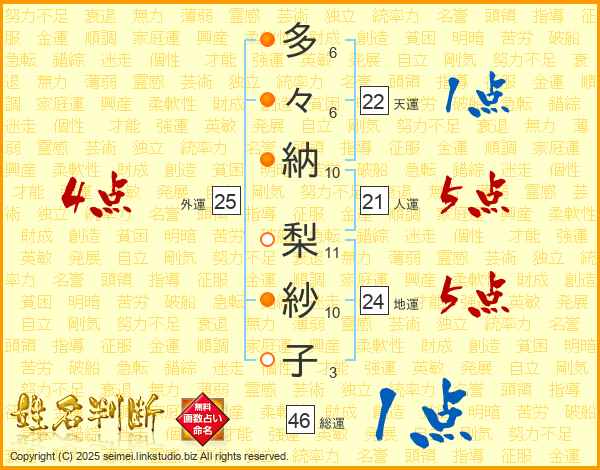 多(6画)々(6画)納(10画) 梨(11画)紗(10画)子(3画)