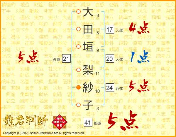 大(3画)田(5画)垣(9画) 梨(11画)紗(10画)子(3画)