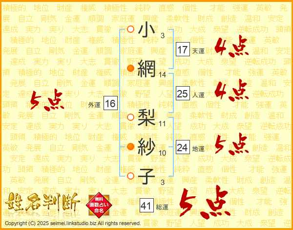 小(3画)網(14画) 梨(11画)紗(10画)子(3画)
