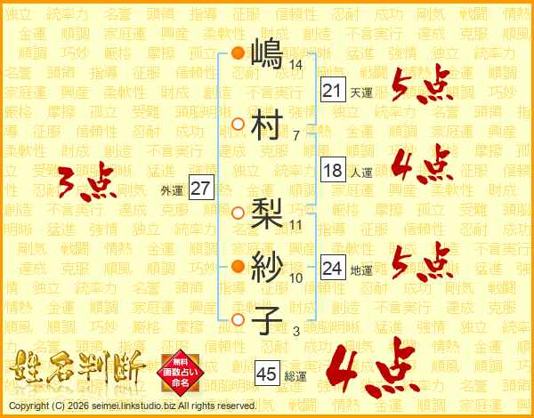 嶋(14画)村(7画) 梨(11画)紗(10画)子(3画)