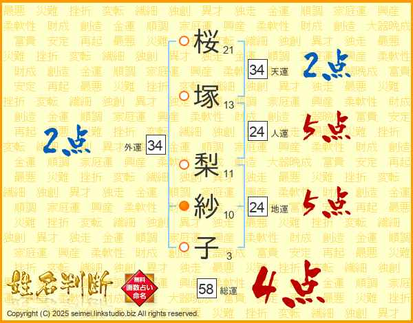 桜(21画)塚(13画) 梨(11画)紗(10画)子(3画)