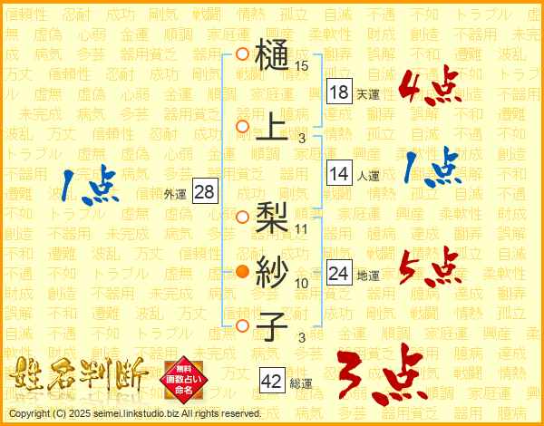 樋(15画)上(3画) 梨(11画)紗(10画)子(3画)