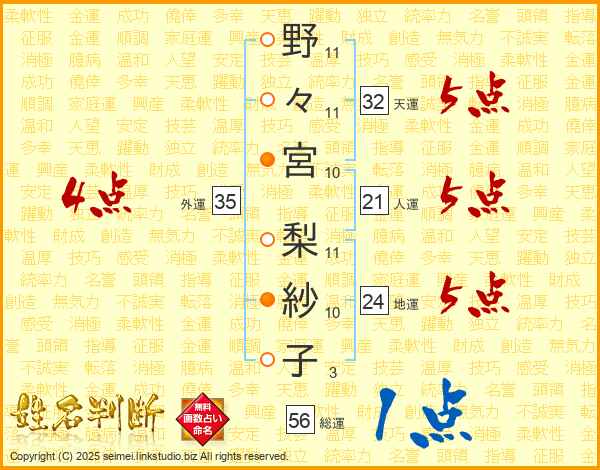 野(11画)々(11画)宮(10画) 梨(11画)紗(10画)子(3画)
