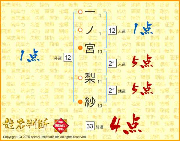 一(1画)ノ(1画)宮(10画) 梨(11画)紗(10画)