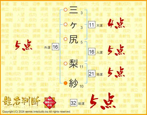三(3画)ヶ(3画)尻(5画) 梨(11画)紗(10画)