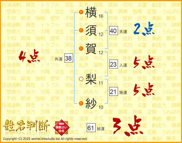 横須賀梨紗さんの外運は38画の4点!