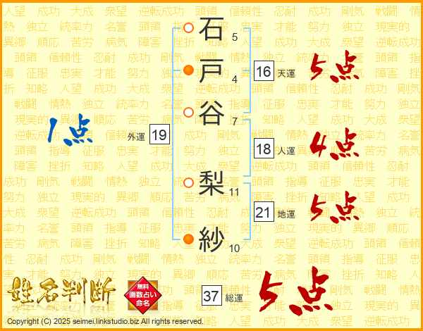 石(5画)戸(4画)谷(7画) 梨(11画)紗(10画)
