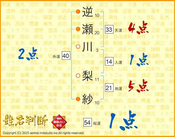 逆(10画)瀬(20画)川(3画) 梨(11画)紗(10画)
