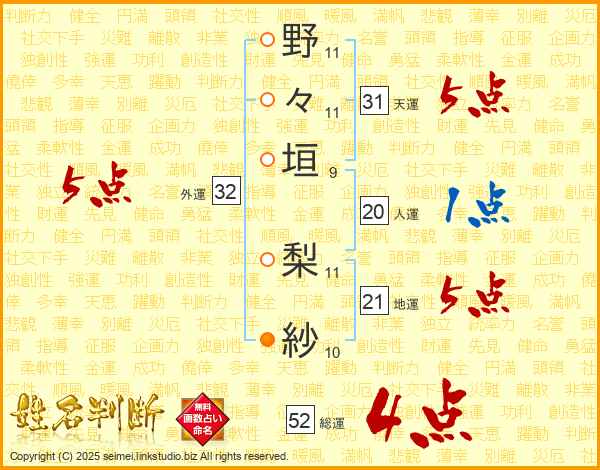 野々垣梨紗さんの総運は52画の4点!