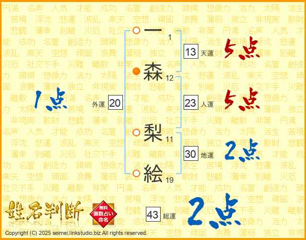 生活面を象徴する運勢です。外部から受ける影響力を表し、結婚運、家庭運や職場、環境への順応性を表します。総運から人運を引いた画数。姓や名が1文字の場合を除く。