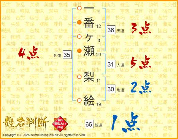 一番ヶ瀬梨絵さんの総運は66画の1点!