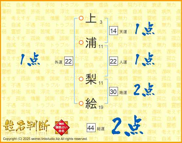 上(3画)浦(11画) 梨(11画)絵(19画)