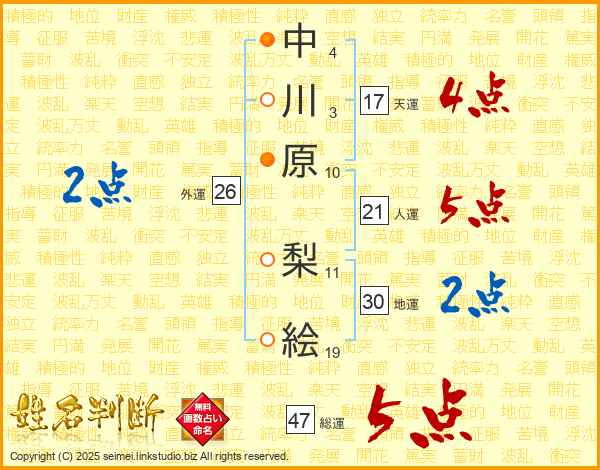 生活面を象徴する運勢です。外部から受ける影響力を表し、結婚運、家庭運や職場、環境への順応性を表します。総運から人運を引いた画数。姓や名が1文字の場合を除く。