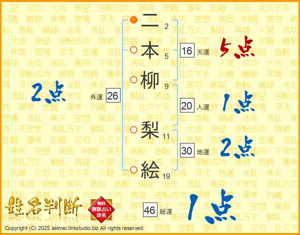 二(2画)本(5画)柳(9画) 梨(11画)絵(19画)
