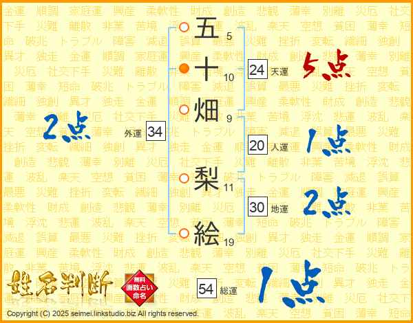 生活面を象徴する運勢です。外部から受ける影響力を表し、結婚運、家庭運や職場、環境への順応性を表します。総運から人運を引いた画数。姓や名が1文字の場合を除く。
