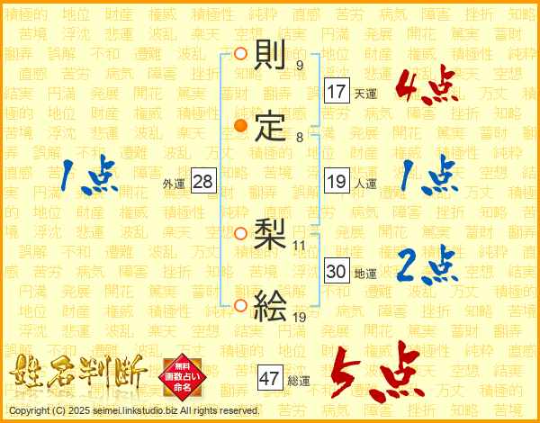 生活面を象徴する運勢です。外部から受ける影響力を表し、結婚運、家庭運や職場、環境への順応性を表します。総運から人運を引いた画数。姓や名が1文字の場合を除く。