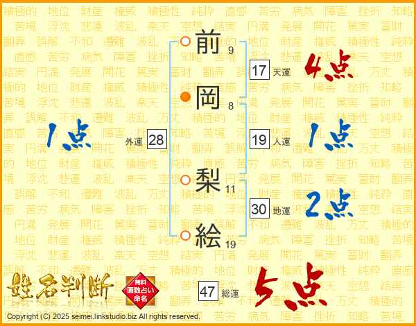前(9画)岡(8画) 梨(11画)絵(19画)