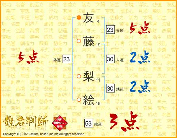 友(4画)藤(19画) 梨(11画)絵(19画)