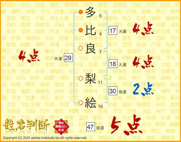 多(6画)比(4画)良(7画) 梨(11画)絵(19画)