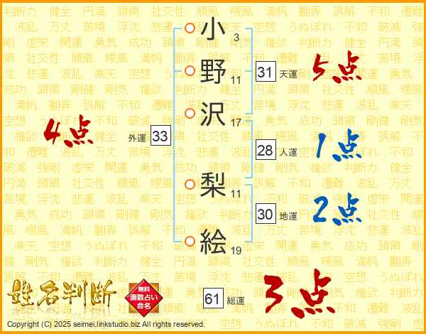 小(3画)野(11画)沢(17画) 梨(11画)絵(19画)