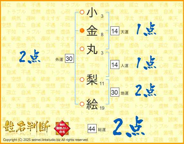 小(3画)金(8画)丸(3画) 梨(11画)絵(19画)