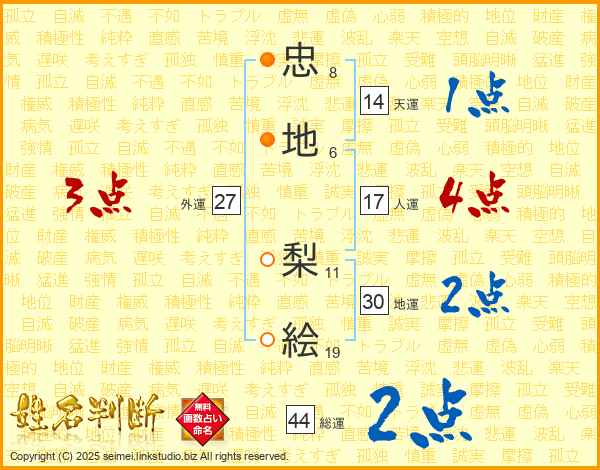 忠(8画)地(6画) 梨(11画)絵(19画)