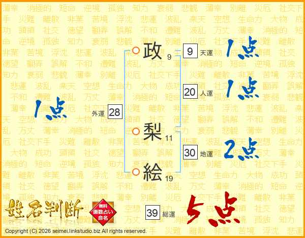 生活面を象徴する運勢です。外部から受ける影響力を表し、結婚運、家庭運や職場、環境への順応性を表します。総運から人運を引いた画数。姓や名が1文字の場合を除く。
