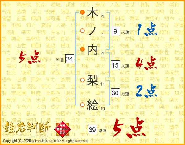 木(4画)ノ(1画)内(4画) 梨(11画)絵(19画)