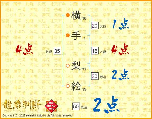 生活面を象徴する運勢です。外部から受ける影響力を表し、結婚運、家庭運や職場、環境への順応性を表します。総運から人運を引いた画数。姓や名が1文字の場合を除く。