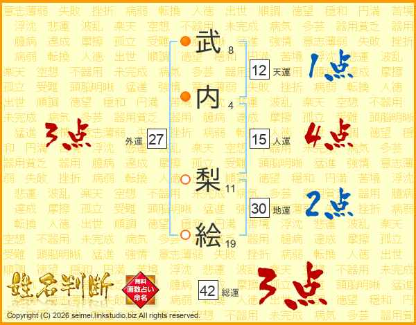 生活面を象徴する運勢です。外部から受ける影響力を表し、結婚運、家庭運や職場、環境への順応性を表します。総運から人運を引いた画数。姓や名が1文字の場合を除く。
