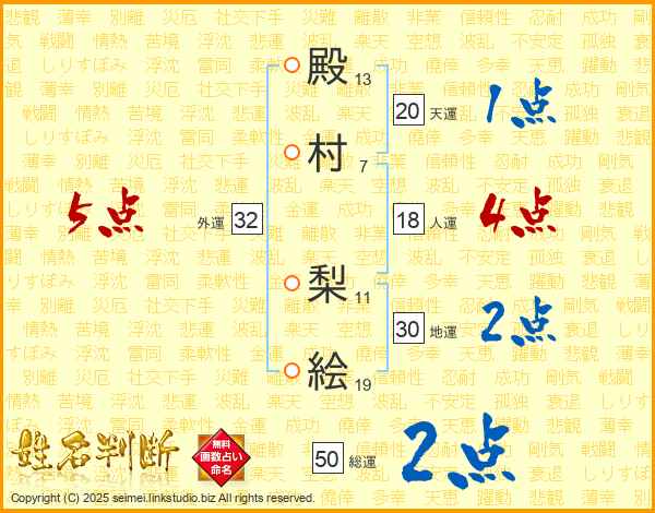殿(13画)村(7画) 梨(11画)絵(19画)