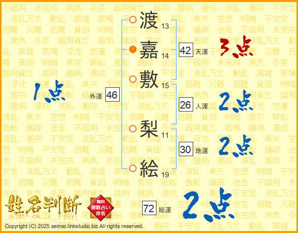 渡(13画)嘉(14画)敷(15画) 梨(11画)絵(19画)