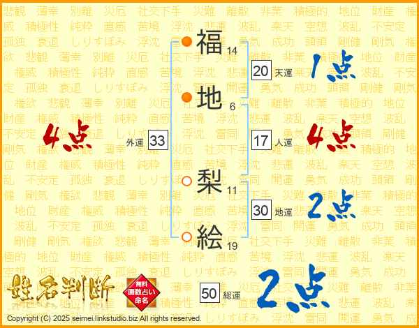 生活面を象徴する運勢です。外部から受ける影響力を表し、結婚運、家庭運や職場、環境への順応性を表します。総運から人運を引いた画数。姓や名が1文字の場合を除く。