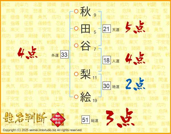 秋(9画)田(5画)谷(7画) 梨(11画)絵(19画)