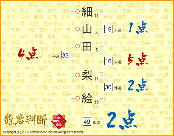 細(11画)山(3画)田(5画) 梨(11画)絵(19画)