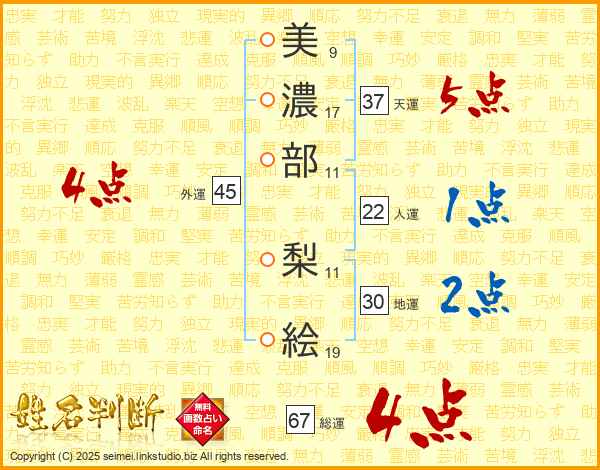 美(9画)濃(17画)部(11画) 梨(11画)絵(19画)