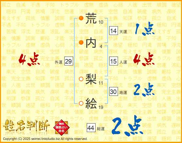 荒(10画)内(4画) 梨(11画)絵(19画)