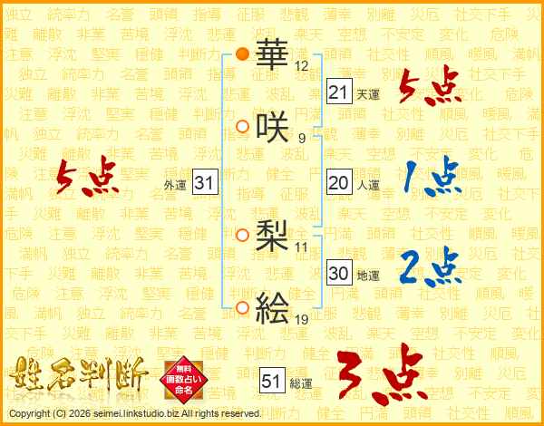 華(12画)咲(9画) 梨(11画)絵(19画)