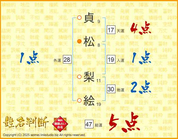 貞(9画)松(8画) 梨(11画)絵(19画)